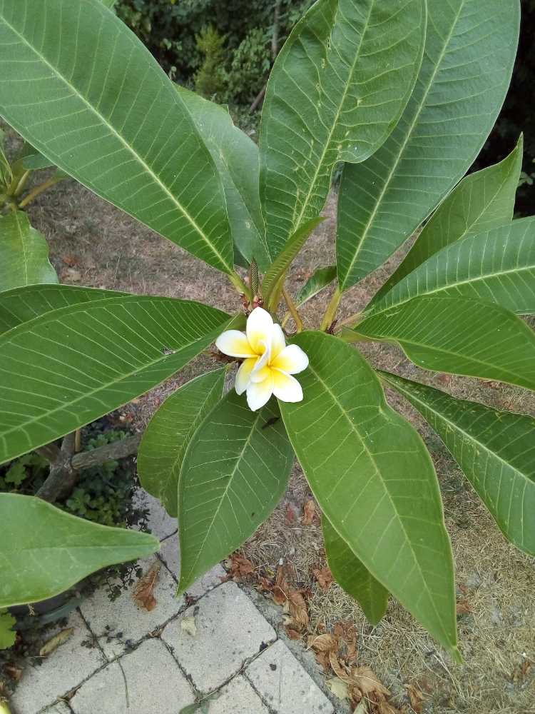 Le frangipanier n'a pas assez de fleurs pour être odorant! il a privilégié les feuilles cette année!