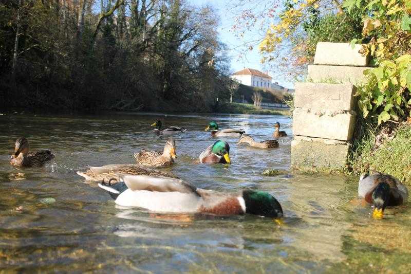 Nono initie ses rejetons à la navigation sur rivière, il peut y avoir parfois du courant car cette rivière débite beaucoup malgré les apparences (il y a une usine électrique en face de chez moi, ainsi que plusieurs autres en aval). On voit aussi Tartine la colvert, qui aime bien la compagnie des barbaries.