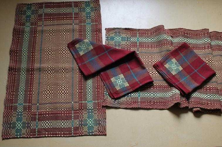 Les dernières réalisations en tissage. Un ensemble de table démarré en mars de cette année et terminé juste à temps pour m'en servir pour les fêtes :