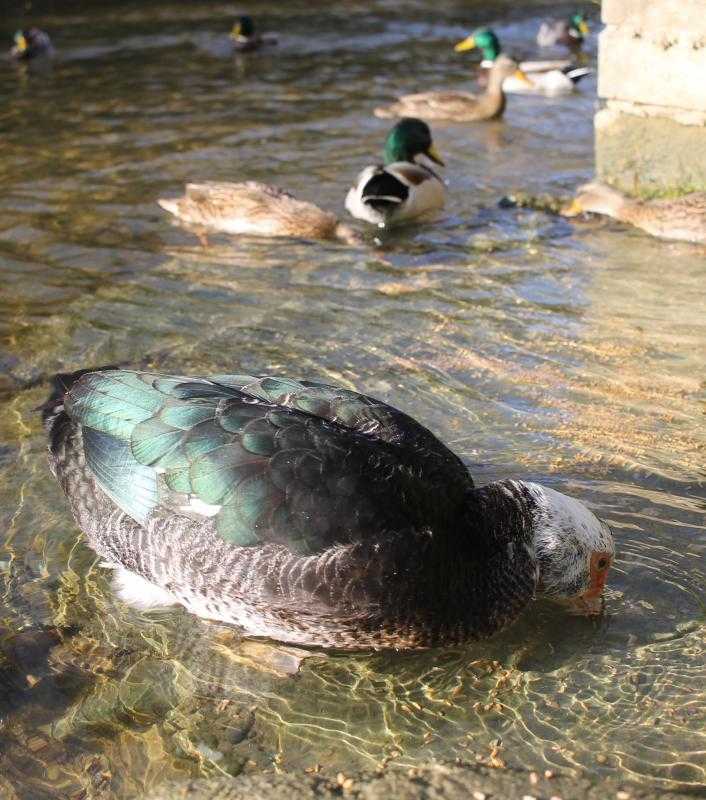 Mes colverts qui m'attendent tous les midis pour leur distribution journalière de grains :