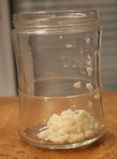 Je met mes grains de kéfir dans un récipient en verre, pour la quantité, mettons une grosse cuillère à soupe pour 400 ml de lait (ici je vais utiliser 800 ml de lait). Je rince toujours mes grains à l'eau claire avant de m'en servir, sinon ils finissent par prendre un goût trop fort.