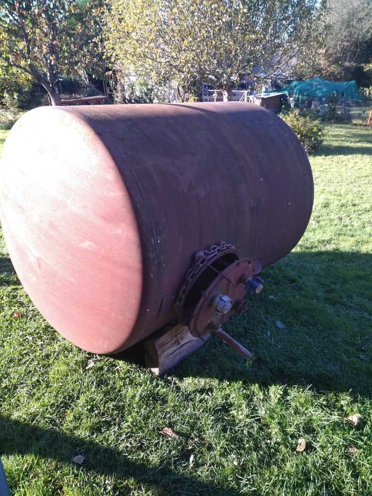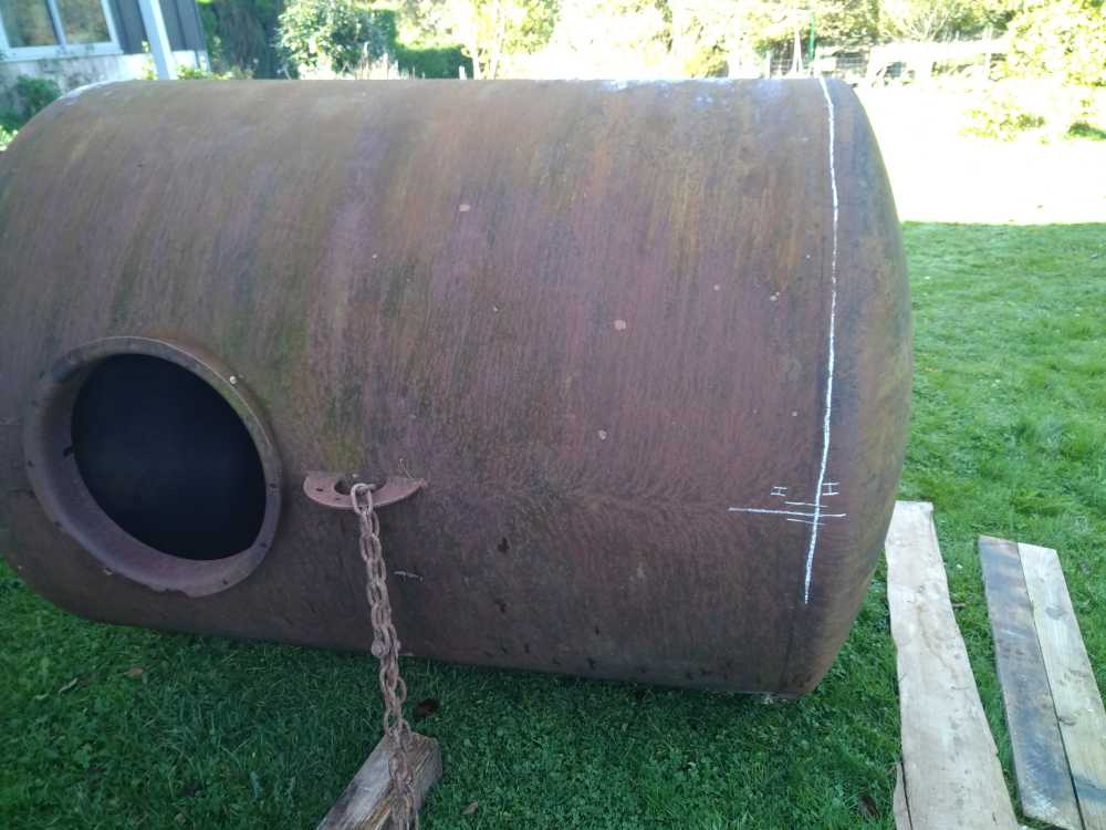 Donc j'ai decider de partir d'une ancienne cuve a fioul qui etait enterré et donc que j'avais eu l'occasion de recuperer ....elle est en acier tres epais d'un diametre de 130 cm et de 2 00 cm de long environ 2500 litres de capacités environ